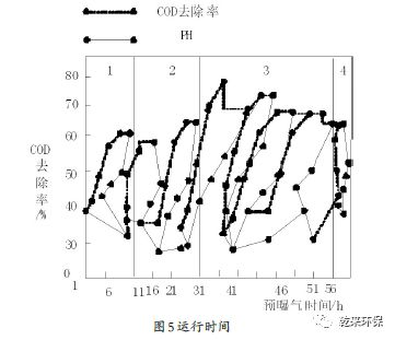 通過適量的預(yù)曝氣,能夠去除廢水中的污染物,從而提升PH值。適當(dāng)?shù)目刂茀?shù)有助于難生物降解的COD轉(zhuǎn)化為易生物降解的COD,為了提高在這四個階段的COD去除效果,可以將第二階段的運行時間加長,如圖5所示。