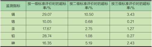 表1 土壤環(huán)境質(zhì)量主要重金屬監(jiān)測(cè)指標(biāo)超標(biāo)率統(tǒng)計(jì)表