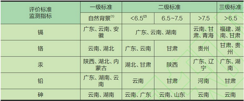 注:(1):一級(jí)標(biāo)準(zhǔn)體現(xiàn)土壤自然背景值,不區(qū)分土壤pH值;(2):二級(jí)標(biāo)準(zhǔn)按土壤pH值不同區(qū)分,三級(jí)標(biāo)準(zhǔn)pH值大于6.5。