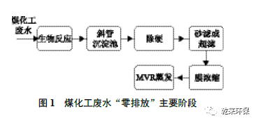 隨著環(huán)保政策的收緊,國家對已建和新建的煤化工項(xiàng)目要求廢水“零排放”。雖然不同煤化工工藝產(chǎn)生的廢水性質(zhì)有所差異,但傳統(tǒng)處理煤化工廢水的工藝大多包括生物活性處理、化學(xué)沉淀、懸浮物過濾、膜濃縮產(chǎn)水回用和蒸發(fā)固化等。圖1 為煤化工廢水“零排放”主要階段示意。