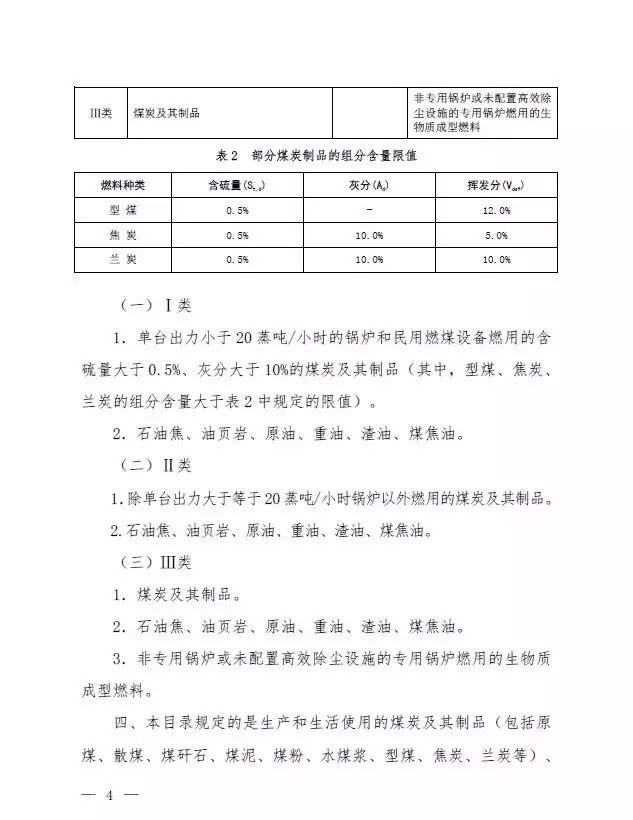 第Ⅰ類,考慮到中西部地區(qū)部分城市煤炭使用還存在規(guī)?;讲桓叩默F(xiàn)象,從鼓勵煤炭清潔利用角度,提出單臺出力小于20蒸噸/小時的鍋爐和民用燃煤設(shè)備燃用的含硫量大于0.5%、灰分大于10%的煤炭納入禁燃范圍。其中,型煤、焦炭、蘭炭的揮發(fā)分含量不能大于12%、5%和10%,對型煤的灰分含量沒有要求。