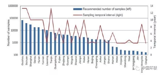 土壤重金屬污染是動(dòng)態(tài)變化的,重金屬濃度隨污染源的輸入和植物吸收、流水等作用輸出的變化而變化。如何在時(shí)間和空間上監(jiān)測(cè)土壤重金屬污染狀況的變化特征亦是一個(gè)不可忽視的重要問題。通過對(duì)前一次樣點(diǎn)的定位,再次采集、分析,比較同一樣點(diǎn)前后兩次土壤重金屬濃度的變化,是最為有效的監(jiān)測(cè)土壤重金屬變化的方式。但因土壤的空間異質(zhì)性、采樣方法和統(tǒng)計(jì)誤差等影響,土壤重金屬濃度變異度的數(shù)值大小可以通過再次采樣而被檢測(cè)是需要考慮的問題。同時(shí),多次大量的樣品采集雖然能夠提高監(jiān)測(cè)精度,但成本也相應(yīng)升高,在操作上不現(xiàn)實(shí)。監(jiān)測(cè)精度和成本的平衡,監(jiān)測(cè)區(qū)域樣品數(shù)量和監(jiān)測(cè)時(shí)間間隔的確定是至關(guān)重要的問題。中國(guó)地質(zhì)大學(xué)Xia等在全國(guó)土壤調(diào)查的基礎(chǔ)上,以主要行政區(qū)域和主要重金屬污染元素為對(duì)象,研究土壤重金屬污染變化監(jiān)測(cè)的樣品采集數(shù)量和采集時(shí)間間隔,發(fā)現(xiàn)由于研究區(qū)域大的空間變異,很難確定土壤重金屬濃度最小可監(jiān)測(cè)的變異;根據(jù)成本、可實(shí)踐性和檢測(cè)的精度,考慮重金屬元素的變異性和設(shè)定變異程度,針對(duì)不同區(qū)域推薦了一系列合適采樣數(shù)量,不同區(qū)域檢測(cè)的時(shí)間間隔為3.3~13.3 年(圖1)。該研究為區(qū)域性土壤重金屬污染變化監(jiān)測(cè)提供較好的研究思路和方法。