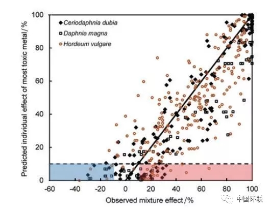 土壤重金屬污染對(duì)生態(tài)和人體健康的危害,因污染程度、污染元素種類以及暴露途徑的不同而不同。目前相關(guān)的環(huán)境風(fēng)險(xiǎn)評(píng)估和環(huán)境質(zhì)量標(biāo)準(zhǔn)的主要以單一污染物為基礎(chǔ),這與土壤重金屬污染常為多元素的復(fù)合型污染不盡一致。由于金屬間的相互作用,以及金屬與生物體作用可能表現(xiàn)為協(xié)同、拮抗或無相互作用等,導(dǎo)致多種金屬元素混合比單一元素具有不同的環(huán)境效應(yīng)。在復(fù)合污染生物毒性研究中,常用兩種模型,獨(dú)立作用(independent action)和濃度加和(concentration addition)參考模型,前者認(rèn)為金屬元素毒性作用不同,后者則認(rèn)為具有相似的作用效果;但是兩個(gè)模型均認(rèn)為污染物在目標(biāo)點(diǎn)位上沒有相互作用,該假設(shè)與實(shí)際情況不盡相符。比利時(shí)根特大學(xué)Nys等通過設(shè)定多種金屬復(fù)合,開展了30多組大型蚤、模糊網(wǎng)紋蚤和大麥毒性試驗(yàn),檢驗(yàn)在低濃度下獨(dú)立作用和濃度加和參考模型適用性。部分重金屬單獨(dú)存在對(duì)測(cè)試生物影響效應(yīng)在10%以下,而經(jīng)復(fù)合后可產(chǎn)生高達(dá)66%的抑制作用(圖2);整體上獨(dú)立作用參考模型對(duì)混合毒性預(yù)測(cè)精度更高,濃度加和參考模型則更為保守;在風(fēng)險(xiǎn)評(píng)估中更為重要的低劑量水平上,用濃度加和參考模型預(yù)測(cè)的重金屬復(fù)合對(duì)模糊網(wǎng)紋蚤和大麥毒性比觀測(cè)值高1.4~3.6倍。該研究結(jié)果表明,目前所應(yīng)用的單一重金屬的風(fēng)險(xiǎn)評(píng)價(jià),對(duì)于重金屬復(fù)合情況可能不夠保守。