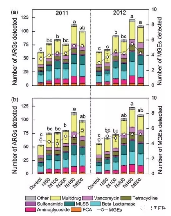 抗生素對(duì)細(xì)菌感染、致病微生物感染類疾病的防治具有重要作用,但由此而來的抗性基因的快速增加和傳播也威脅著人體健康。抗性基因的研究越發(fā)受到學(xué)者關(guān)注,成為研究熱點(diǎn)。除抗生素選擇產(chǎn)生抗性基因外,環(huán)境中重金屬對(duì)抗生素抗性的選擇和傳播擴(kuò)散具有重要作用。中國(guó)科學(xué)院生態(tài)環(huán)境研究中心Hu等通過對(duì)Ni長(zhǎng)期污染土壤誘導(dǎo)的抗性基因進(jìn)行研究,發(fā)現(xiàn)在長(zhǎng)期不同程度Ni污染下,共檢測(cè)到149種抗性基因,以多藥和β-內(nèi)酰胺類抗生素抗性為主,抗性基因的頻率和豐度隨Ni污染程度的增加而升高(圖3);抗性基因與可移動(dòng)抗性原件具有顯著相關(guān)性,表明Ni污染增加了抗性基因的水平轉(zhuǎn)移,該水平轉(zhuǎn)移與intI1整合子有關(guān)。區(qū)別于以往重金屬的直接毒性風(fēng)險(xiǎn),該研究闡述了重金屬在土壤環(huán)境中的間接風(fēng)險(xiǎn)-增加抗性基因產(chǎn)生和傳播風(fēng)險(xiǎn)。