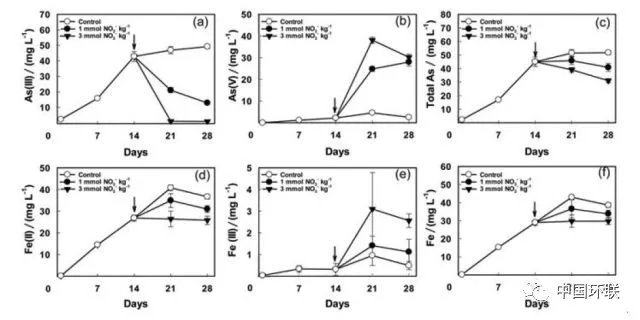 圖4 硝酸鹽加入后土壤溶液As和Fe形態(tài)變化