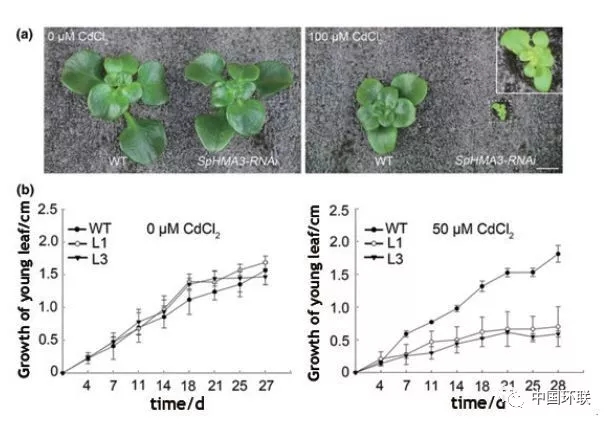 利用超積累植物修復(fù)重金屬污染土壤一直是研究學(xué)者們關(guān)注的焦點(diǎn)。區(qū)別于普通植物,超積累植物地上部可富集高濃度的重金屬。其可能作用機(jī)制為:超積累植物的根際對(duì)土壤重金屬活化效應(yīng);超積累植物對(duì)重金屬具有快速的吸收轉(zhuǎn)運(yùn)體系;超積累植物對(duì)重金屬具有強(qiáng)的解毒儲(chǔ)存能力。浙江大學(xué)Hou等對(duì)比研究重金屬超積累型和非超積累型植物的根際特征,發(fā)現(xiàn)與非超積累型植物相比,超積累型植物根際具有更為龐大的根系,土壤pH值較低,重金屬有效性高;根際土壤重金屬有效性與超積累植物特異的細(xì)菌群落具有顯著相關(guān)性,微生物群落功能分析(PICRUSt)超積累植物根際細(xì)菌豐度相對(duì)較高,其相應(yīng)的功能與膜運(yùn)輸和氨基酸代謝相關(guān)。該研究揭示了超積累植物根際特征,尤其是特異的根際細(xì)菌群落組成對(duì)超積累植物吸收重金屬的作用。除超積累植物特殊的根際效應(yīng)外,其植物本身對(duì)重金屬吸收和存儲(chǔ)能力亦是超積累重金屬主要機(jī)制。浙江大學(xué)Tian等對(duì)超積累型和非積累型東南景天對(duì)Cd吸收、分布以及細(xì)胞水平上耐性進(jìn)行研究。Cd在非積累型植物葉和莖中維管束中有少量分布,而超積累植物Cd含量高,且不同組織和時(shí)間上差異較大;兩種植物在Cd向葉原生質(zhì)運(yùn)輸?shù)膭?dòng)力學(xué)上沒有較大差異,但超積累型在Cd的液泡存儲(chǔ)上更為高效。該研究結(jié)果表明相對(duì)于快速運(yùn)輸至薄壁細(xì)胞,Cd的液泡高效存貯是東南景天莖中積累Cd的更為重要的機(jī)制。超積累植物對(duì)重金屬的積累和解毒機(jī)制受控于體內(nèi)特有基因表達(dá)。中國(guó)科學(xué)院植物研究所Liu等對(duì)鎘鋅超積累植物伴礦景天Cd耐性基因進(jìn)行研究,發(fā)現(xiàn)伴礦景天體內(nèi)的ATP酶3基因(SpHMA3)對(duì)其Cd在體內(nèi)解毒具有重要作用,酵母中外源SpHMA3表達(dá)試驗(yàn)表明其具有Cd專一運(yùn)輸活性,對(duì)Cd敏感而對(duì)Zn不敏感,SpHMA3基因在非超積累型景天中超量表達(dá)可增加其對(duì)Cd的耐性和積累性,但對(duì)Zn無效應(yīng)。該研究結(jié)果證實(shí)位于液泡膜上的SpHMA3基因?qū)χ参顲d解毒機(jī)制起著重要作用,能保持伴礦景天在Cd污染土壤上正常生長(zhǎng)(圖5)。