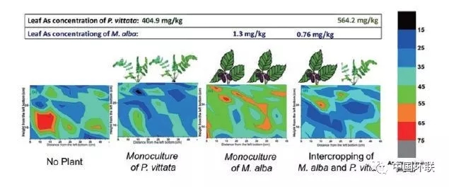 除降低可食作物對(duì)重金屬吸收外,在重金屬污染土壤上種植經(jīng)濟(jì)作物,阻控重金屬在食物鏈中的傳遞風(fēng)險(xiǎn),也是污染農(nóng)田安全利用的措施之一。華中農(nóng)業(yè)大學(xué)Yang等針對(duì)重金屬污染土壤研究重金屬耐性經(jīng)濟(jì)作物3種種植模式(油菜-向日葵、油菜-花生、油菜-芝麻),對(duì)土壤重金屬去除效應(yīng)和農(nóng)作物中重金屬濃度的影響進(jìn)行了研究。結(jié)果表明,油菜-向日葵種植模式去除Cd最高,可達(dá)459 g·ha-1,去除率為1.98%;利用正己烷提取后作物油符合相應(yīng)標(biāo)準(zhǔn),去油后種子殘?jiān)俳?jīng)酒石酸鉀提取后,其重金屬濃度低于飼料標(biāo)準(zhǔn)。經(jīng)濟(jì)作物與超積累植物間作,在安全生產(chǎn)的同時(shí)也能去除土壤污染物,實(shí)現(xiàn)修復(fù)目的。但是在超積累植物和其他植物間作體系下,超積累植物對(duì)重金屬活化和吸收機(jī)制還不清楚,超積累植物是否活化重金屬,增加非超積累植物對(duì)重金屬吸收。中國(guó)科學(xué)院地理科學(xué)與資源研究所Wan等開展了As超積累植物蜈蚣草和桑樹間作的研究,探討了邊生產(chǎn)邊修復(fù)機(jī)制。與單作相比,間作處理?xiàng)l件下蜈蚣草中As濃度顯著增加、桑樹As則顯著降低;對(duì)不同處理下土壤As的空間分布分析發(fā)現(xiàn),不論單作或間作處理蜈蚣草根周圍土壤As濃度較低,沒有活化土壤As(圖10),且在間作處理下桑樹葉中As濃度符合國(guó)家飼料標(biāo)準(zhǔn)。