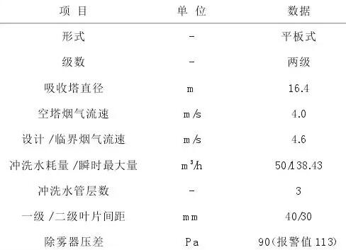 某發(fā)電公司660MW超臨界燃煤空冷機(jī)組,鍋爐型號(hào):DG2100/25.4-II2,配套建設(shè)有石灰石-石膏濕法脫硫裝置。每座吸收塔頂部安裝兩級(jí)水平布置的除霧器,參數(shù)見(jiàn)表1。
