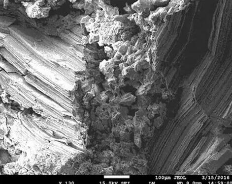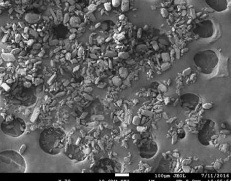 根據(jù)化學(xué)分析結(jié)果可見(jiàn),除霧器上的垢物與石膏的組成較為接近,主要成分均為CaS04˙2H20。結(jié)合除霧器的工作機(jī)理,可以認(rèn)為除霧器的垢物與石膏的來(lái)源均為脫硫漿液所攜帶的固體顆粒物。但是掃描電鏡微觀(guān)顯示其晶體形態(tài)完全不同,除霧器垢物是顆粒與片狀晶體的混合物,而脫硫石膏呈現(xiàn)出顆粒狀(或短柱狀)晶體結(jié)構(gòu)。