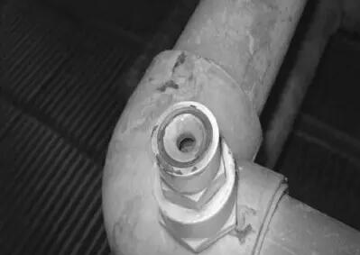 在事故發(fā)生后,檢修人員對(duì)該機(jī)組沖洗水管道和噴嘴進(jìn)行了逐個(gè)檢查,結(jié)果表明50多個(gè)噴嘴發(fā)生了堵塞或脫落。原因是噴嘴形式為軸向?qū)嵭腻F,外觀(guān)如圖3所示,兩級(jí)除霧器下表面沖洗水管上的噴嘴均為噴口向上,除霧器葉片上脫落的軟垢極易進(jìn)入噴嘴的出口,由于不是連續(xù)沖洗,噴嘴出口堆積的軟垢經(jīng)過(guò)一段時(shí)間的停留,會(huì)變得結(jié)實(shí)從而造成噴嘴堵塞。