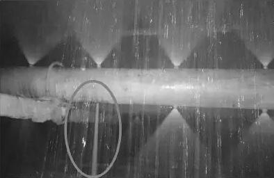 另外當(dāng)沖洗水含固量較高或存在異物時(shí),也會(huì)造成噴嘴堵塞。在后續(xù)運(yùn)行中,發(fā)生噴嘴堵塞的區(qū)域形成沖洗死角,除霧器葉片無(wú)法得到?jīng)_洗,極易結(jié)垢。另外還有部分沖洗水噴嘴脫落或沖洗水管斷裂,也會(huì)大大降低沖洗效果。如圖4所示,紅圈處的噴嘴脫落,沖洗水成柱狀下流,沖洗面積大大減小,所對(duì)應(yīng)的區(qū)域?qū)o(wú)法得到有效沖洗。此類(lèi)故障在運(yùn)行中難以發(fā)現(xiàn),需要每次停機(jī)時(shí)加強(qiáng)檢修,及時(shí)將脫落和堵塞的噴嘴進(jìn)行修復(fù)。