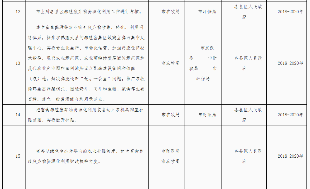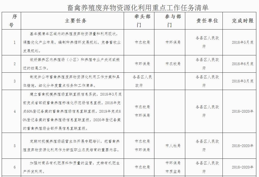 (三)落實屬地管理責任。落實“菜籃子”市長負責制,堅持保供給與保環(huán)境并重,統(tǒng)籌畜產(chǎn)品供給和畜禽糞污治理。各縣區(qū)政府對本行政區(qū)域內(nèi)的畜禽養(yǎng)殖廢棄物資源化利用工作負總責,要結(jié)合本地實際,依法明確部門職責,構(gòu)建責任體系,健全工作機制,加大資金投入,完善政策措施,強化日常監(jiān)管,確保各項任務(wù)落實到位。各縣區(qū)人民政府應(yīng)于2018年3月底前制定并公布畜禽養(yǎng)殖廢棄物資源化利用工作方案,細化分年度的重點任務(wù)和工作清單,并抄送市農(nóng)牧局備案。