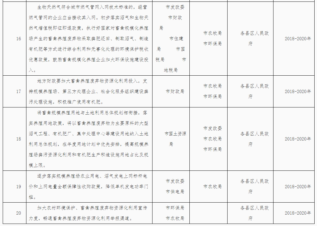 (五)推動種養(yǎng)循環(huán)發(fā)展。各縣區(qū)要盡快編制種養(yǎng)循環(huán)發(fā)展規(guī)劃,引導建立糧飼統(tǒng)籌、農(nóng)牧結(jié)合、養(yǎng)防并重、種養(yǎng)一體的種養(yǎng)循環(huán)綠色發(fā)展機制,促進畜牧業(yè)持續(xù)健康發(fā)展。推動建立畜禽糞污等農(nóng)業(yè)有機廢棄物收集、轉(zhuǎn)化、利用網(wǎng)絡(luò)體系,支持采取政府和社會資本合作(PPP)模式,調(diào)動社會資本在養(yǎng)殖密集區(qū)域建立糞污集中處理中心,探索規(guī)?;?、專業(yè)化、社會化運營機制,加快畜禽糞污處理全產(chǎn)業(yè)鏈建設(shè)。培育壯大多種類型的糞污處理社會化服務(wù)組織,實行專業(yè)化生產(chǎn)、市場化運營。鼓勵建立受益者付費機制,保障第三方處理企業(yè)和社會化服務(wù)組織合理收益。加強糞肥還田技術(shù)指導,鼓勵沼液和經(jīng)無害化處理的畜禽養(yǎng)殖廢水作為肥料科學還田利用。優(yōu)先支持現(xiàn)代農(nóng)業(yè)示范區(qū)、農(nóng)業(yè)可持續(xù)發(fā)展試驗示范區(qū)和現(xiàn)代農(nóng)業(yè)產(chǎn)業(yè)園在田間地頭配套建設(shè)管網(wǎng)和儲糞(液)池等方式,解決糞肥還田“最后一公里”問題。到2020年新(改擴)建大中型沼氣21處,新(改擴)建有機肥生產(chǎn)企業(yè)5家。