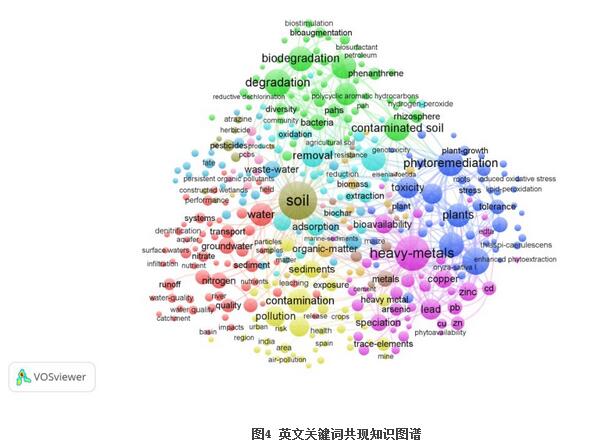 將webofscience上檢索到的9323條英文數(shù)據(jù)導入VOSviewer,共分析了491個關鍵詞,得出的高頻關鍵詞見表3。據(jù)統(tǒng)計,soil(土壤),heavy-metals(重金屬),出現(xiàn)頻次最高,可見重金屬的污染防治一直是領域的關注重點。degradation(退化)排名第四,反映出近5年來土壤退化問題備受關注。此外,植物修復和微生物修復也是近來的研究熱點。