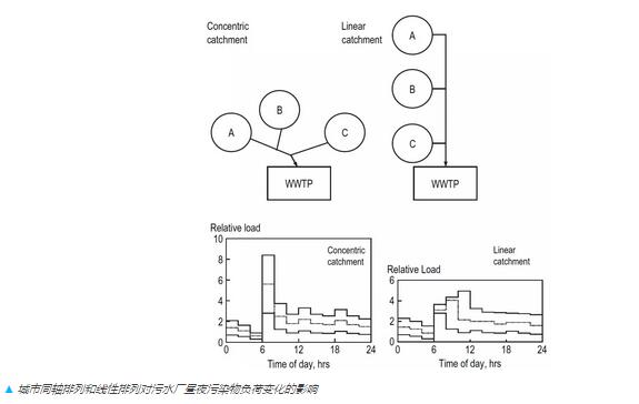 Gujer教授提醒我們污水處理系統(tǒng)除了污水處理廠之外,管網(wǎng)也是其重要的組成。污水廠的進(jìn)水負(fù)荷變化在某程度是由于污染物進(jìn)入管網(wǎng)時(shí)間的差異,以及管網(wǎng)分布的長(zhǎng)度造成的,這兩個(gè)因素都跟時(shí)間這個(gè)變量有關(guān)。Gujer教授用下圖闡述了同軸排列和線性排列兩種排放模式的區(qū)別——前者的負(fù)荷變化更大,而后者的收集方式能使進(jìn)水水質(zhì)更穩(wěn)定。由于晝夜負(fù)荷變化很大程度上控制了生物處理過(guò)程中的硝化性能,所以使用后者的城市規(guī)劃模式對(duì)該地區(qū)的污水處理是有好處的。