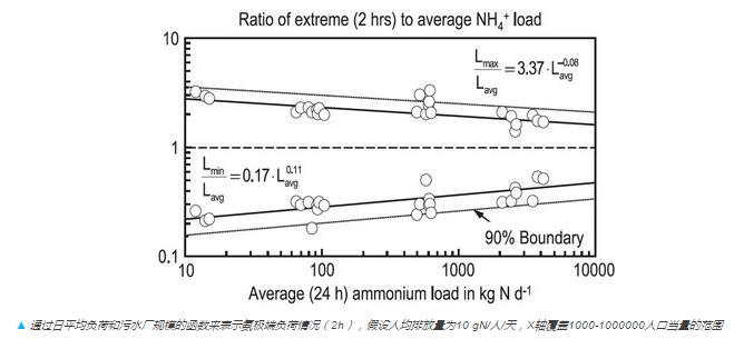 下圖總結(jié)了不同污水收集方式下氨的極端負(fù)荷和日平均負(fù)荷的比值。由于硝化處理設(shè)計(jì)的安全系數(shù)通常按照最大負(fù)荷和平均負(fù)荷的比值來(lái)設(shè)定,因此該圖能提供重要的設(shè)計(jì)信息。根據(jù)此圖,我們會(huì)發(fā)現(xiàn)安全系數(shù)的選定是個(gè)很有趣的事情——安全系數(shù)(也就是相應(yīng)的SRT)設(shè)定越大,污水廠的處理能力就變小,因此專業(yè)性就降低,而且更加難以運(yùn)行。