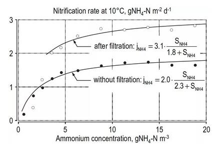 但是Gujer教授也承認(rèn),雖然這個(gè)模型一方面對(duì)開(kāi)發(fā)新工藝技術(shù)很有幫助,但是他們當(dāng)時(shí)也意識(shí)到模型的局限性——在縮減的空間和時(shí)間里,它并不能將實(shí)際工程應(yīng)用的方方面面都成功模擬。例如下圖,中試實(shí)驗(yàn)顯示經(jīng)過(guò)無(wú)硝化高效生物處理后的生物濾池三級(jí)處理的硝化情況顯示過(guò)濾截留了二級(jí)處理出水中的懸浮固體,但是在實(shí)際應(yīng)用中卻不是這樣。