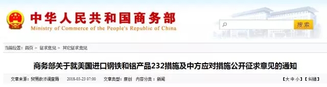商務(wù)部關(guān)于就美國進(jìn)口鋼鐵和鋁產(chǎn)品232措施及中方應(yīng)對措施公開征求意見的通知