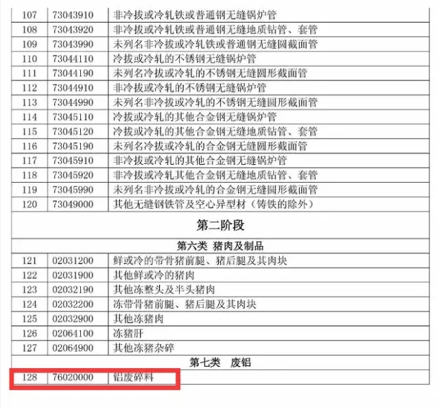 該清單暫定包含7類、128個稅項產(chǎn)品,按2017年統(tǒng)計,涉及美對華約30億美元出口。第一部分共計120個稅項,涉及美對華9.77億美元出口,包括鮮水果、干果及堅果制品、葡萄酒、改性乙醇、花旗參、無縫鋼管等產(chǎn)品,擬加征15%的關(guān)稅。第二部分共計8個稅項,涉及美對華19.92億美元出口,包括豬肉及制品、回收鋁等產(chǎn)品,擬加征25%的關(guān)稅。