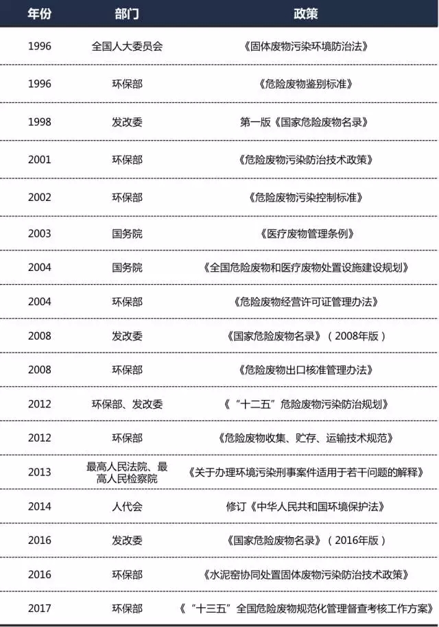 危廢政策不斷出臺,尤其是省級細(xì)則落地:1)2017年環(huán)保部出臺“十三五”全國危險廢物規(guī)范化管理督查考核工作方案,各省近期均推出省級危廢規(guī)范化管理督查方案;2)《國家危險廢物名錄》自2016年8月1日起施行;新修訂的《固體廢物污染環(huán)境防治法》取消危險廢物省內(nèi)轉(zhuǎn)移審批手續(xù);3)2016年最高司法機關(guān)就環(huán)境污染犯罪出臺專門司法解釋;4)2018年起實施《環(huán)境保護稅法》,危廢稅額1000元/噸;5)環(huán)保部發(fā)布《水泥窯協(xié)同處置固體廢物污染防治技術(shù)政策》,支持水泥窯協(xié)同處置。
