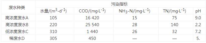 河北省某化工企業(yè)主要生產(chǎn)有機(jī)顏料,廢水來(lái)源主要是工藝廢水、廢氣吸收廢水、地面沖洗水、生活污水等。廢水按水質(zhì)可以分為4大類:第1類為高濃度廢水A(COD高、鹽分低),主要來(lái)源于精制廢水、濾洗廢水、粗品車(chē)間廢水,主要污染物為COD、苯系物等;第2類為高濃度廢水B(COD高、鹽分高),主要來(lái)源于結(jié)晶過(guò)濾廢水、濾洗廢水、精餾塔頂流出液、廢氣吸收廢水、粗品車(chē)間廢水、母液,主要污染物為COD、苯系物、二氯乙烷、二甲基甲酰胺、水合肼、鹽分等;第3類為低濃度廢水C,主要來(lái)源于消化廢水、水沖泵廢水、地面沖洗廢水、蒸餾放料槽廢水、蒸汽尾水、生活污水,主要污染物為COD、SS、氨氮、總磷、苯系物等;第4類為稀廢水D,主要來(lái)源于產(chǎn)品洗水,主要污染物為COD、SS等。根據(jù)廢水水質(zhì)不同先分質(zhì)處理,再合并處理。最終處理出水執(zhí)行《污水排入城鎮(zhèn)下水道水質(zhì)標(biāo)準(zhǔn)》(CJ343—2010)的B等級(jí)標(biāo)準(zhǔn)。各類廢水水質(zhì)水量如表1所示。