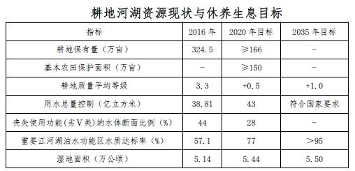 到2020年,耕地數(shù)量穩(wěn)定、質(zhì)量提高,河湖生態(tài)空間有效恢復(fù),濕地面積增加,耕地河湖生態(tài)功能有效改善,資源有效保護(hù)和高效利用的政策與技術(shù)支撐體系基本建立。到2035年,耕地河湖資源利用與養(yǎng)護(hù)全面步入良性循環(huán),資源休養(yǎng)生息制度體系更加完善,形成資源利用高效、生態(tài)系統(tǒng)穩(wěn)定、農(nóng)業(yè)可持續(xù)發(fā)展、水生態(tài)環(huán)境優(yōu)良的新格局,實(shí)現(xiàn)人與自然和諧共生。