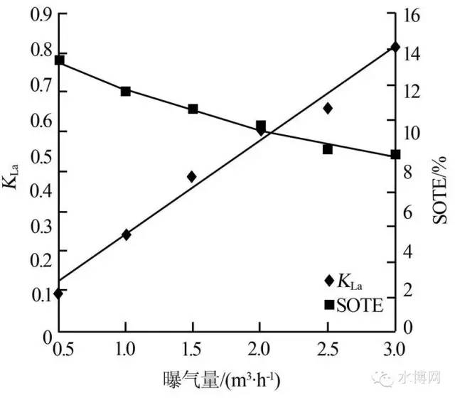 由圖2可知,KLa隨曝氣量的增加而逐漸增大。主要是因為曝氣量越大,氣液接觸面積增大,充氧效率提高。另一方面,有研究者發(fā)現(xiàn)氧利用率隨曝氣量的增加而減小,本試驗也發(fā)現(xiàn)了類似情況。這是因為在一定水深下,曝氣量較小時增加了氣泡在水中的停留時間,氣液接觸時間延長;曝氣量較大時對水體擾動較強,大部分氧氣未有效利用,最終以氣泡形式從水面釋放到空氣中。本試驗得出的氧利用率與文獻相比不高,可能是反應(yīng)器高度不夠,大量氧氣未與水體接觸便逸出,降低了氧利用率。