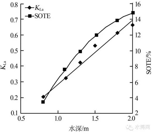 圖6表明,隨著水深的增加,KLa和氧利用率均呈明顯的增大趨勢,KLa在水深0.8m處和水深2m處相差4倍多。這是因為水深越大,氣泡在水體中的停留時間越長,氣液接觸時間就越長,氧傳質(zhì)效果越好。
