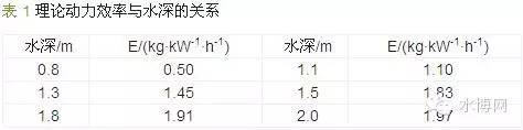 因此,曝氣器安裝越深越有利于充氧能力和氧利用率的提高。但安裝水深增加的同時阻力損失也會增加,為了克服阻力損失,就必須增加曝氣量,這勢必會導(dǎo)致能耗和運行成本的增加。因此,為了得到最佳安裝水深,有必要對理論動力效率與水深的關(guān)系進行評估,見表1。