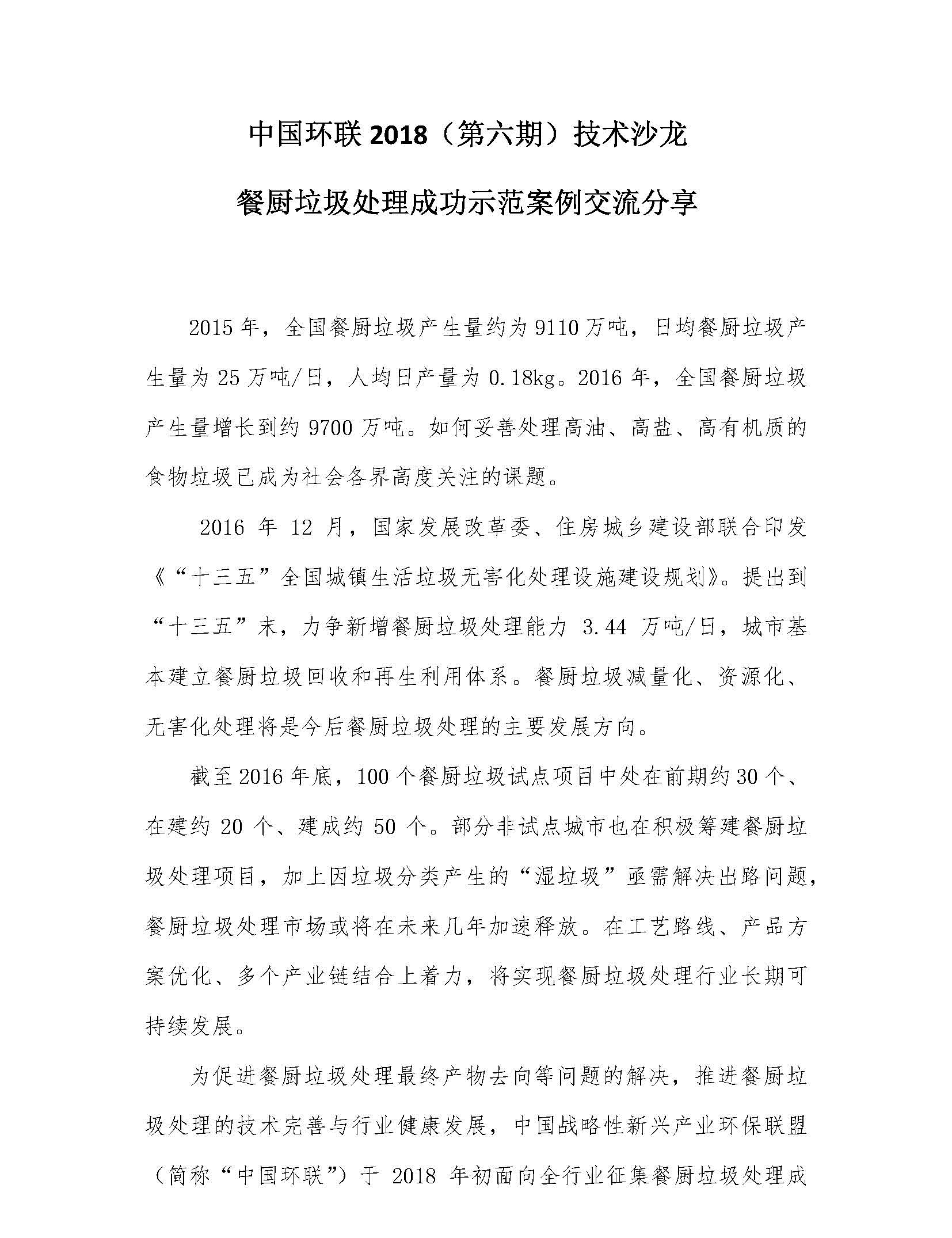 中國(guó)環(huán)聯(lián)2018(第六期)技術(shù)沙龍 餐廚垃圾處理成功示范案例交流分享