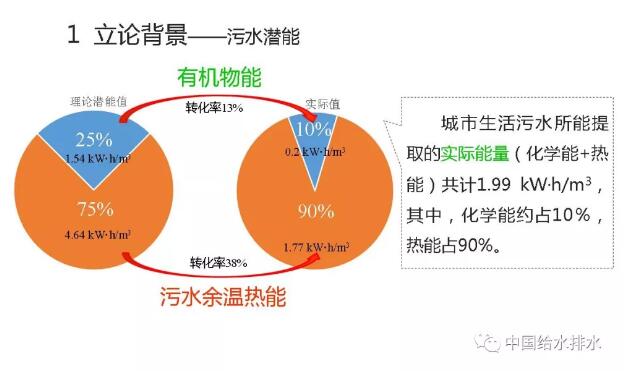 今天我的發(fā)言既與碳中和有關(guān)也跟磷回收有關(guān)。那么,關(guān)于碳中和談得是污水處理的耗能過程,有機(jī)物及氮磷去除要消耗能量,碳中和即需要從污水處理廠或污水里找到能量去彌補(bǔ)能耗。對(duì)此,大家更多會(huì)想到剩余污泥里有大量含能有機(jī)物,這也是我們搞污水處理人所關(guān)注的,所以,污泥厭氧消化從傳統(tǒng)到現(xiàn)在,以至于有更多的人前赴后繼對(duì)厭氧消化進(jìn)行優(yōu)化提高其能量轉(zhuǎn)化效率,包括前處理,比如說,高碑店現(xiàn)在的熱水解,就是希望最大化把污泥中的有機(jī)能源轉(zhuǎn)化出來。但是,我們搞污水處理的人忽視了一個(gè)問題,就是說除了有機(jī)物形成的化學(xué)能以外,還有大量污水中的余溫?zé)崮?。?qǐng)大家看這個(gè)圖,有機(jī)物中的化學(xué)能與污水中余溫?zé)崮芟啾龋苌?、很少。理論上一個(gè)75%,一個(gè)25%。也就是說污泥中有機(jī)物的化學(xué)能只占整個(gè)污水中潛能的25%,75%是熱能。我們給大家先看這樣一個(gè)概念,也就是說我們所關(guān)注的厭氧消化轉(zhuǎn)化的能源占整個(gè)污水中的潛能,理論值是25%。那么這25%的有機(jī)能源又能轉(zhuǎn)化多少呢?顯然這是個(gè)理論值,不可能100%轉(zhuǎn)化。