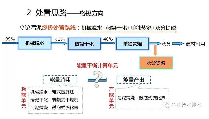 因此,最后只有去“燒”!但是,“燒”必須要經(jīng)過機(jī)械脫水,含水率99%的污泥首先降至80%;然后,再熱干化到40%以下。到40%就可以自持燃燒了。燒,但污泥焚燒千萬不能放在水泥窯中同水泥一塊燒。這樣不對(duì)。會(huì)把磷就全部固定在水泥里,磷再也不能回用了!所以,要單獨(dú)燒。最多可以跟有機(jī)垃圾一塊燒。燒完以后,大量的磷都在灰分里面,需要提取。當(dāng)然了,大家知道,脫水、熱干化、單獨(dú)焚燒都是要輸入能量的,當(dāng)焚燒之后也會(huì)產(chǎn)生能量?,F(xiàn)在我們有一個(gè)問題,就是輸入能量和產(chǎn)生的能量能否達(dá)到平衡?我們需要計(jì)算一下,如果能打個(gè)平手那就是很了不起的事了。