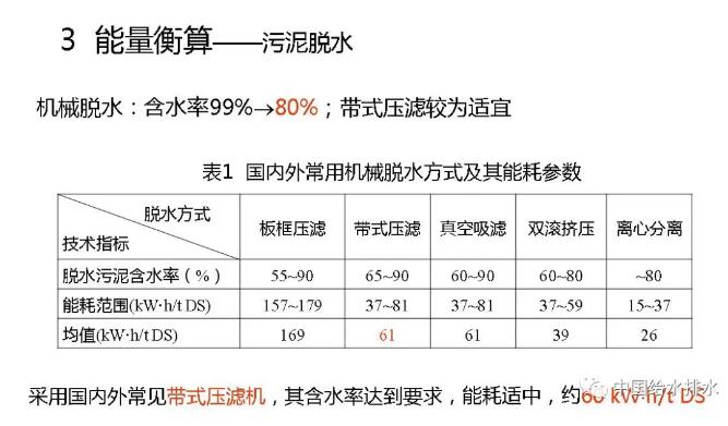 接下來我們看一下計(jì)算結(jié)果。大家知道,機(jī)械脫水有各種各樣的方法,99%~80%,這里列了很多技術(shù)與設(shè)備,我也不一一匯報(bào)了。常見的是帶式壓濾機(jī),能達(dá)到80%含水率的要求,所以,我們就以帶式壓濾機(jī)為例進(jìn)行計(jì)算,大概耗能折合成干固體每噸是60千瓦小時(shí),即,60度電。熱干化,也就是從80%~40%,我知道搞干化設(shè)備的人有很多,到40%以后基本上就可以自持燃燒了。干化的時(shí)候輸入熱能進(jìn)行蒸發(fā),所需熱量一個(gè)是用于污泥中水分升溫繼而蒸發(fā)的熱量,還有就是污泥升溫的熱量。