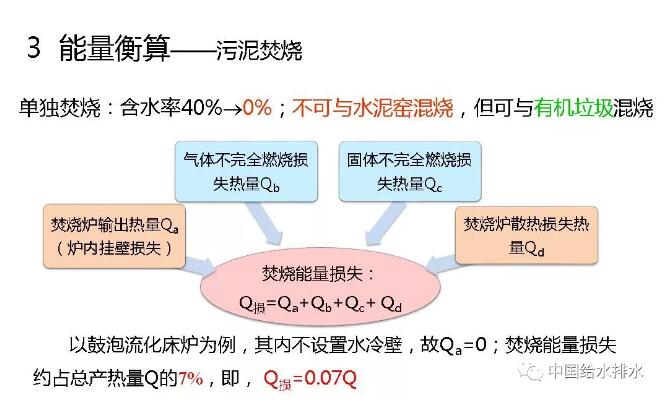 單獨(dú)焚燒,含水率40%~0%。不可與水泥窯混燒,但可與有機(jī)垃圾混燒。焚燒有熱量損失,焚燒爐輸出的熱量,比如說爐內(nèi)壁掛損失、焚燒爐散熱損失等等,所有損失加在一起,以鼓泡流化床為例,大概就是7%,即占焚燒產(chǎn)生熱量的7%,這都是有文獻(xiàn)可查的。污泥焚燒也產(chǎn)生熱量,這個(gè)熱量主要跟有機(jī)質(zhì)有關(guān),這個(gè)是計(jì)算公式。我們國家有機(jī)質(zhì)含量比較低,在30%~60%的范圍,我們計(jì)算時(shí)取污泥有機(jī)質(zhì)含量中間值53%,北京大概是60%。計(jì)算污泥燃燒熱為1.2GJ/kgDS。這是不同國家污泥燃燒值,中國大概在個(gè)范圍,平均是11850kJ/kgDS。我們的計(jì)算跟這個(gè)1.185GJ/kgDS基本接近,這都是從文獻(xiàn)來的數(shù)據(jù)。這樣經(jīng)過計(jì)算以后,污泥脫水+干化+焚燒,脫水要輸入能量,干化要輸入能量,焚燒產(chǎn)生能量;最后的結(jié)果會(huì)發(fā)現(xiàn)總耗能是3091度電每噸干固體??偖a(chǎn)能11.1GJ,利用熱電聯(lián)產(chǎn)轉(zhuǎn)換為電當(dāng)量為2467度電。也就是說整個(gè)工藝的能量輸入為624度電。下面是詳細(xì)的計(jì)算表,不講了。