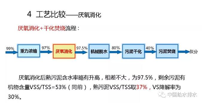 第二個(gè)比較就是跟傳統(tǒng)厭氧消化進(jìn)行比較。傳統(tǒng)厭氧消化前面有重力濃縮,含水率99%~97%,然后厭氧消化,含水率再略微增加一點(diǎn)點(diǎn)。因?yàn)閰捬跸笾辽龠€有60%左右的有機(jī)物殘留,你還得脫水、干化。干化后污泥焚燒是跑不掉的。大家看一下,我們厭氧消化以后含水率按97.5%計(jì),剩余污泥有機(jī)物含量是53%,熟污泥VSS/TSS是37%。