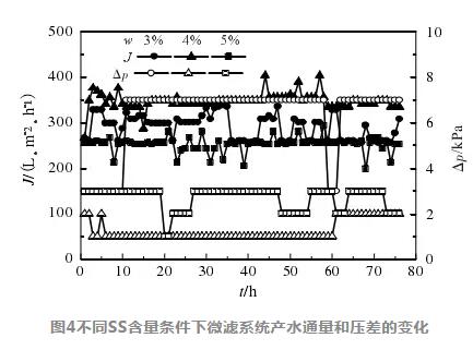 由圖4可知,不同SS含量條件下的產(chǎn)水通量均出現(xiàn)不同程度的波動;壓差在大部分時(shí)間內(nèi)保持穩(wěn)定,部分出現(xiàn)降低的點(diǎn)。分析原因是實(shí)驗(yàn)過程中溫度變化造成的,當(dāng)溫度升高時(shí),產(chǎn)水通量增大,壓差會有所降低。