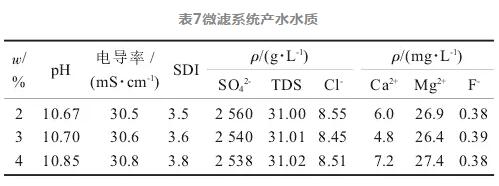 由圖5和表7可知,微濾系統(tǒng)產(chǎn)水濁度在0.16~0.3 NTU小幅波動,膜污染指數(shù)SDI小于3.8。隨著固含量的升高產(chǎn)水濁度略有降低、SDI略有上升??傮w來看系統(tǒng)運(yùn)行穩(wěn)定,而且SS的質(zhì)量分?jǐn)?shù)為3%時(shí)的產(chǎn)水通量最大,產(chǎn)水量穩(wěn)定時(shí)間更長。