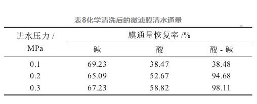 水中的顆粒、有機(jī)物以及膠體等物質(zhì)會在微濾膜表面發(fā)生架橋、吸附進(jìn)而導(dǎo)致膜污堵,因此需要定期對膜進(jìn)行清洗。周衛(wèi)青、李進(jìn)等針對微濾膜的清洗進(jìn)行了相關(guān)研究,確定酸堿聯(lián)合清洗效果最佳。據(jù)此,采用堿洗、酸洗、酸-堿聯(lián)合清洗3個(gè)清洗方案,通過恒定進(jìn)水壓力條件下膜的產(chǎn)水通量的變化來表征膜過濾性能的變化。清洗實(shí)驗(yàn)結(jié)果見表8;