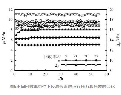 由圖6可知,系統(tǒng)運(yùn)行壓力、壓差均隨著回收率的增大而增大,并且在各個(gè)回收率條件下運(yùn)行時(shí),壓力、壓差基本穩(wěn)定。當(dāng)回收率為75%時(shí),設(shè)備運(yùn)行壓力超過了膜元件本身最高操作壓力( 8.3 MPa),影響膜的使用壽命。