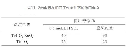 依據(jù)GB/T22839—2010,控制電解液溫度為40 °C 左右、電流密度為2A/cm2,分別以0.5 mol/L的 H2S〇4和減量濃縮后的脫硫廢水做電解液進(jìn)行2組電極的陽極壽命實(shí)驗(yàn),以電解槽電壓升高至5 V所 累計(jì)的電解時(shí)間作為陽極的強(qiáng)化壽命實(shí)驗(yàn)失效時(shí)間,結(jié)果如表11所示。