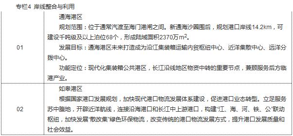推進(jìn)岸線整合與利用。提升開發(fā)利用區(qū)岸線使用效率,合理安排港口岸線、過江通道岸線、取排水口岸線??刂葡嚓P(guān)企業(yè)無序占用岸線,推進(jìn)公共碼頭建設(shè)。港口工業(yè)生產(chǎn)岸線騰退轉(zhuǎn)移,生活、生態(tài)岸線空間穩(wěn)步增加,實(shí)現(xiàn)“三生”空間有序發(fā)展,統(tǒng)籌重要過江通道岸線的控制預(yù)留。加快沿江原南通港區(qū)、任港港區(qū)、狼山港區(qū)、富民港區(qū)以及江海港區(qū)的分期轉(zhuǎn)移和整合,形成沿江五港區(qū)的總體格局。嚴(yán)控新增港口岸線利用,取消或調(diào)整與水源保護(hù)、生態(tài)紅線區(qū)域等有沖突的港口碼頭。對(duì)一些開發(fā)布局不合理、未按國家有關(guān)規(guī)定、不符合規(guī)劃的開發(fā)利用項(xiàng)目逐步加以糾正。對(duì)涉及岸線利用的各類違法違規(guī)行為,重點(diǎn)清理整頓,逐步消除存量,堅(jiān)決遏制增量。依法取締不具備安全生產(chǎn)條件、不符合環(huán)境保護(hù)要求的非法碼頭和裝卸點(diǎn),到2020年,沿江非法碼頭徹底消除。建立健全長江岸線保護(hù)和開發(fā)利用協(xié)調(diào)機(jī)制,統(tǒng)籌岸線與后方土地的使用和管理。探索建立岸線資源有償使用制度。