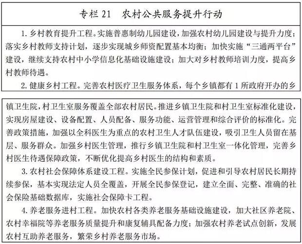 (三)實施數(shù)字鄉(xiāng)村戰(zhàn)略。綜合運用多種技術手段,持續(xù)推進農(nóng)村地區(qū)移動和固定寬帶網(wǎng)絡建設。引導移動、聯(lián)通、電信和廣電等電信運營企業(yè)加大農(nóng)村網(wǎng)絡建設投資,進一步提高農(nóng)村地區(qū)光纖寬帶接入能力,到2020年,農(nóng)村家庭基本具備100M以上接入能力。加大對農(nóng)村移動通信基站鐵塔建設的支持力度,擴大4G無線網(wǎng)絡覆蓋范圍,推動5G網(wǎng)絡布局和商用進程,基本實現(xiàn)農(nóng)村地區(qū)移動寬帶網(wǎng)絡人口全覆蓋。落實農(nóng)村地區(qū)網(wǎng)絡提速降費政策,鼓勵電信運營企業(yè)推出面向貧困戶的網(wǎng)絡資費優(yōu)惠。建設信息進村入戶平臺,完善農(nóng)村消費信息服務、市場信息服務、“三農(nóng)”政策服務、農(nóng)村生活服務等系統(tǒng)和手機APP,推進服務手段向移動終端延伸,服務方式向精準投放轉(zhuǎn)變。推動遠程醫(yī)療、遠程教育等應用普及,建立空間化、智能化的新型農(nóng)村統(tǒng)計信息綜合服務系統(tǒng),彌合城鄉(xiāng)數(shù)字鴻溝。