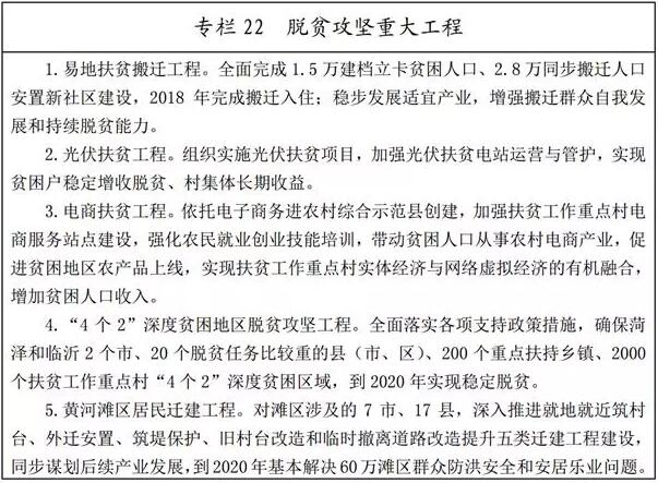 (二)聚焦深度貧困地區(qū)集中發(fā)力。加大對臨沂和菏澤2個市、20個脫貧任務比較重的縣(市、區(qū))、200個重點扶持鄉(xiāng)鎮(zhèn)、2000個省扶貧工作重點村和黃河灘區(qū)等深度貧困地區(qū)的支持力度。以解決突出制約問題為重點,以重大扶貧工程和到村到戶幫扶為抓手,新增脫貧攻堅資金、新增脫貧攻堅項目、新增脫貧攻堅舉措主要用于深度貧困地區(qū),著力改善發(fā)展條件,增強貧困群眾發(fā)展能力,攻克深度貧困堡壘。加快推進易地扶貧搬遷,統(tǒng)籌推進黃河灘區(qū)居民遷建工程建設,推動居民安置、產(chǎn)業(yè)培育同步規(guī)劃、同步實施,加強后續(xù)產(chǎn)業(yè)發(fā)展和轉(zhuǎn)移就業(yè),既讓群眾“挪窮窩”,也幫助其“撥窮根”,2018年全面完成易地扶貧搬遷任務,2020年基本解決60萬灘區(qū)居民防洪安全和安居樂業(yè)問題。