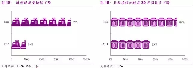 固廢行業(yè)蓬勃發(fā)展也帶來了處置方式的變化。隨著一系列垃圾填埋場(chǎng)污染事件的發(fā)生,美國(guó)公眾對(duì)于垃圾隨意填埋這種簡(jiǎn)單粗暴處置方式的不滿因信息化網(wǎng)絡(luò)化的發(fā)達(dá)而被無限放大。多方因素導(dǎo)致美國(guó)政府逐步關(guān)停垃圾填埋場(chǎng)并減少垃圾填埋量。美國(guó)的城市固體廢物填埋場(chǎng)從1988年的7924座逐步減少為2012年的1908個(gè),送至垃圾填埋場(chǎng)的垃圾占比也由1989年的89%下降到2014年的52%左右。