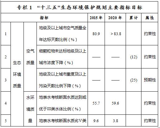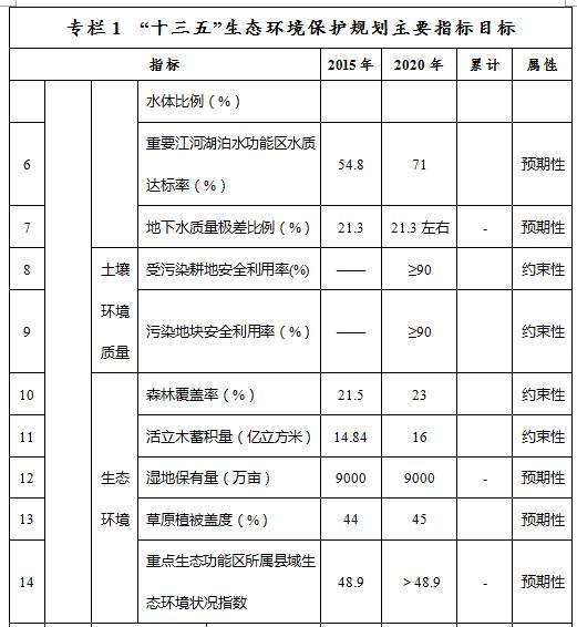 ——環(huán)境質量控制目標指標。到2020年,大氣環(huán)境質量方面,地級及以上城市空氣質量全年達標天數(shù)比例平均達到83.8%以上,重度及以上污染天數(shù)比例下降25%,未達標地級及以上城市PM2.5年均濃度下降12%。水環(huán)境質量方面,全區(qū)地表水質量考核斷面水質達到或優(yōu)于Ⅲ類比例總體達到59.6%,劣Ⅴ類水質比例控制在3.8%,重要江河湖泊水功能區(qū)水質達標率達到71%,全區(qū)地下水質量考核點位水質級別保持穩(wěn)定且極差比例控制在21.3%。土壤環(huán)境質量方面,全區(qū)土壤環(huán)境質量總體保持穩(wěn)定,農用地和建設用地土壤環(huán)境安全得到基本保障,受污染耕地安全利用率和污染地塊安全利用率均達到90%以上。生態(tài)環(huán)境質量方面,森林覆蓋率達23%,活立木蓄積量達16億立方米,濕地保有量達9000萬畝,草原植被蓋度達到45%,重點生態(tài)功能區(qū)所屬縣域生態(tài)環(huán)境狀況指數(shù)達到48.9以上。