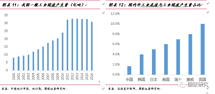 綜合兩種測算方法,我們認(rèn)為2016年我國危廢實際產(chǎn)生量將在1.07-1.24億噸左右,低位值1.07億噸,遠(yuǎn)高于生態(tài)環(huán)境部統(tǒng)計值。