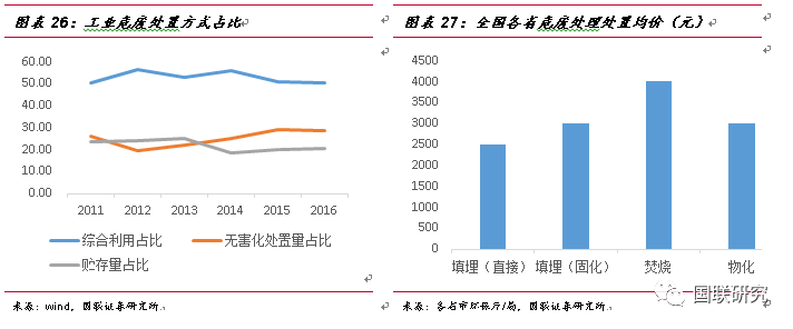 工業(yè)危廢的無害化處置將成為主流。工業(yè)危廢提出“三化”處理原則,即減量化、資源化和無害化,目前主要的處置方式有綜合利用、無害化處置和貯存等。從近幾年的綜合利用、無害化處置方式占比情況看,綜合利用占比整體變化不大,在50%左右,無害化處置方式2016年占比為28.74%,占比在逐年提升,未來預(yù)計將會復(fù)制垃圾焚燒發(fā)電的技術(shù)路線。綜合利用包括回收利用、循環(huán)再生等資源化利用方式。如印刷線路板、電鍍污泥、廢鉛酸電池等很多廢棄物都可進(jìn)行資源化處理,這些固廢含有大量的銅、銀、鎳等重金屬,可以回收使之資源化,提升效益。其利潤來源主要受到貴金屬等大宗商品價格波動的影響。無害化處理方式主要包括破碎、分選、沉降、廢液酸堿中和等物理化學(xué)處理、焚燒熱解及填埋等,其中焚燒處置危險廢物在世界上應(yīng)用廣泛,是最成熟的一種熱處理技術(shù),國內(nèi)的焚燒處理價格相對其他處理方式更高,國內(nèi)焚燒平均價格在2000-4000元/噸不等,有的地區(qū)甚至更高,價格和廢棄物的處理難度和污染成分有關(guān),同時商業(yè)運營模式清晰,未來將成為主流的危廢處置方式。