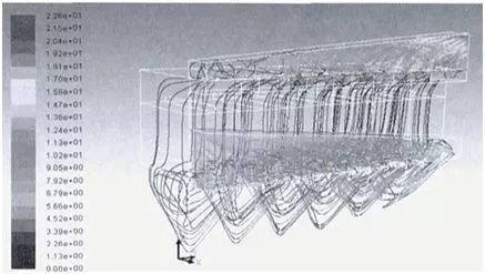利用CAE技術(shù)對(duì)設(shè)備內(nèi)部進(jìn)行CFD流場(chǎng)模擬分析(見圖5),以此結(jié)合新型均風(fēng)結(jié)構(gòu)(已獲國家實(shí)用新型專利)來改善內(nèi)部氣流分布,進(jìn)一步降低設(shè)備結(jié)構(gòu)阻力。