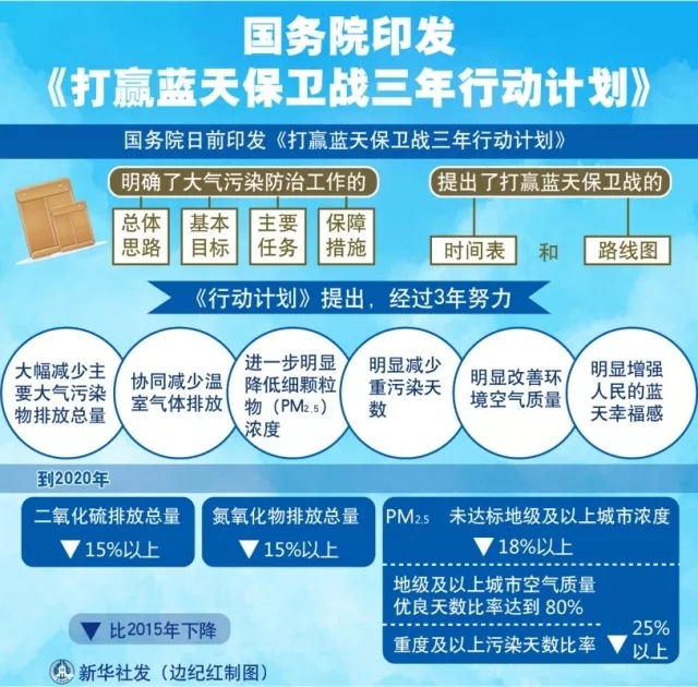經(jīng)李克強(qiáng)總理簽批,國(guó)務(wù)院日前印發(fā)《打贏藍(lán)天保衛(wèi)戰(zhàn)三年行動(dòng)計(jì)劃》(以下簡(jiǎn)稱(chēng)《行動(dòng)計(jì)劃》),明確了大氣污染防治工作的總體思路、基本目標(biāo)、主要任務(wù)和保障措施,提出了打贏藍(lán)天保衛(wèi)戰(zhàn)的時(shí)間表和路線圖。