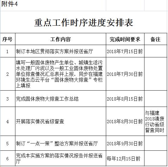 ---2018年7月30日前,市級(jí)環(huán)保部門(mén)在縣級(jí)環(huán)保部門(mén)填報(bào)的基礎(chǔ)上,將一般固體廢物產(chǎn)生單位、城鎮(zhèn)生活污水處理廠污泥以及一般工業(yè)固體廢物處置單位排查情況匯總表(附件1、2、3)上報(bào)省環(huán)保廳,并同步在福建環(huán)境生態(tài)云平臺(tái)“固體廢物大排查”專欄上填報(bào)。